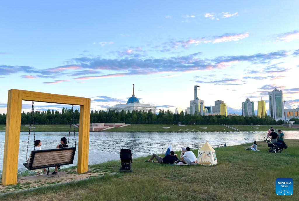 People enjoy their leisure time by the Ishim River in Astana, Kazakhstan, June 29, 2024. (Xinhua/Pang Xinglei)