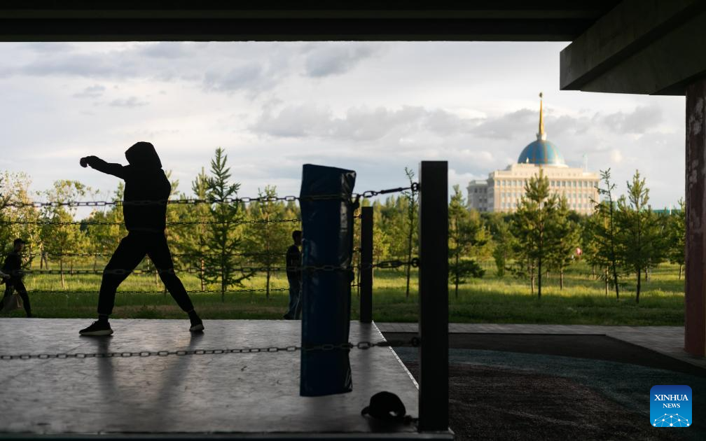 A man practices boxing at a playground in Astana, Kazakhstan, July 2, 2024. (Xinhua/Bai Xueqi)