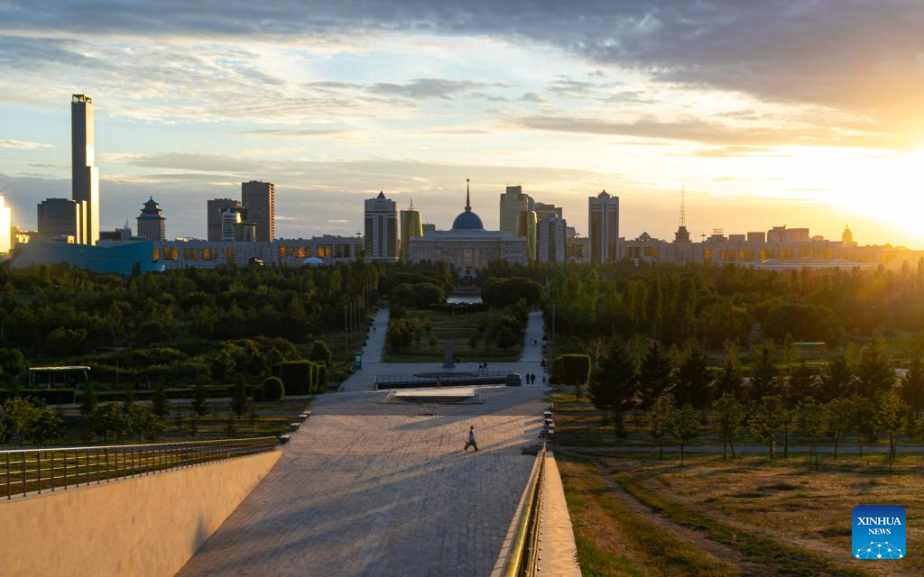 This photo taken on July 2, 2024 shows a view of the city skyline at sunset in Astana, Kazakhstan. (Xinhua/Wang Jianhua)