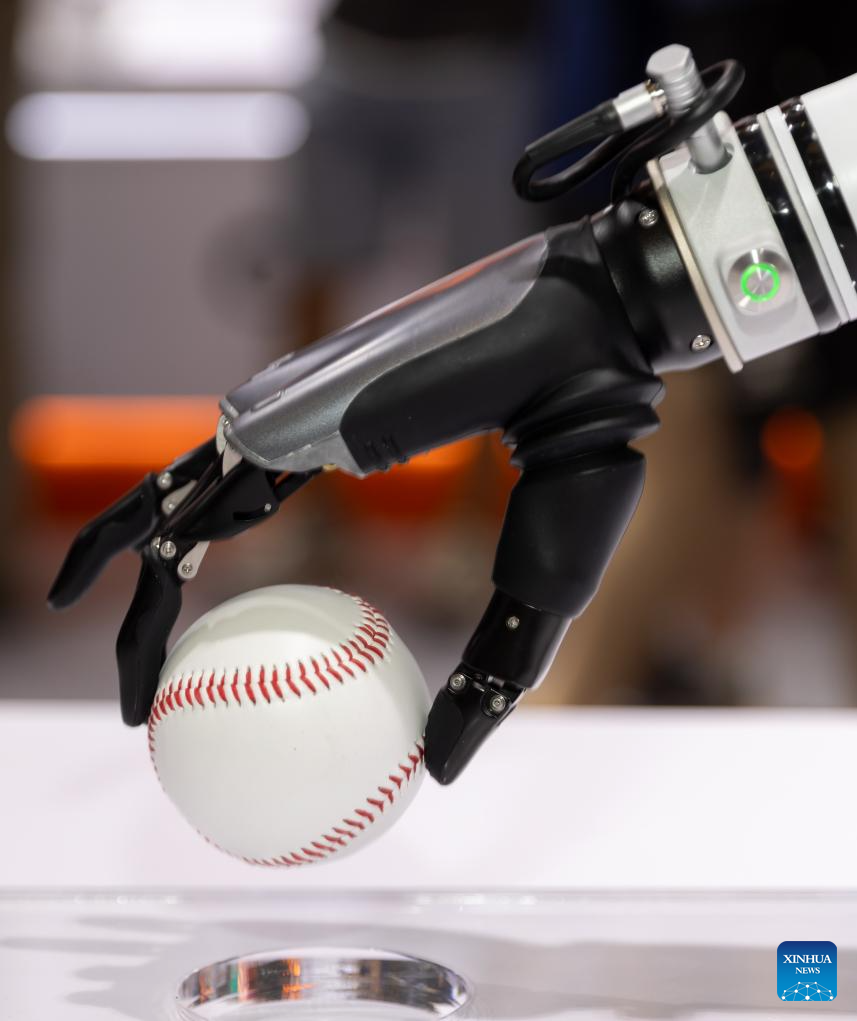 A dexterous robotic hand picks up a baseball during the 2024 World AI Conference in Shanghai, east China, July 4, 2024. (Xinhua/Wang Xiang)