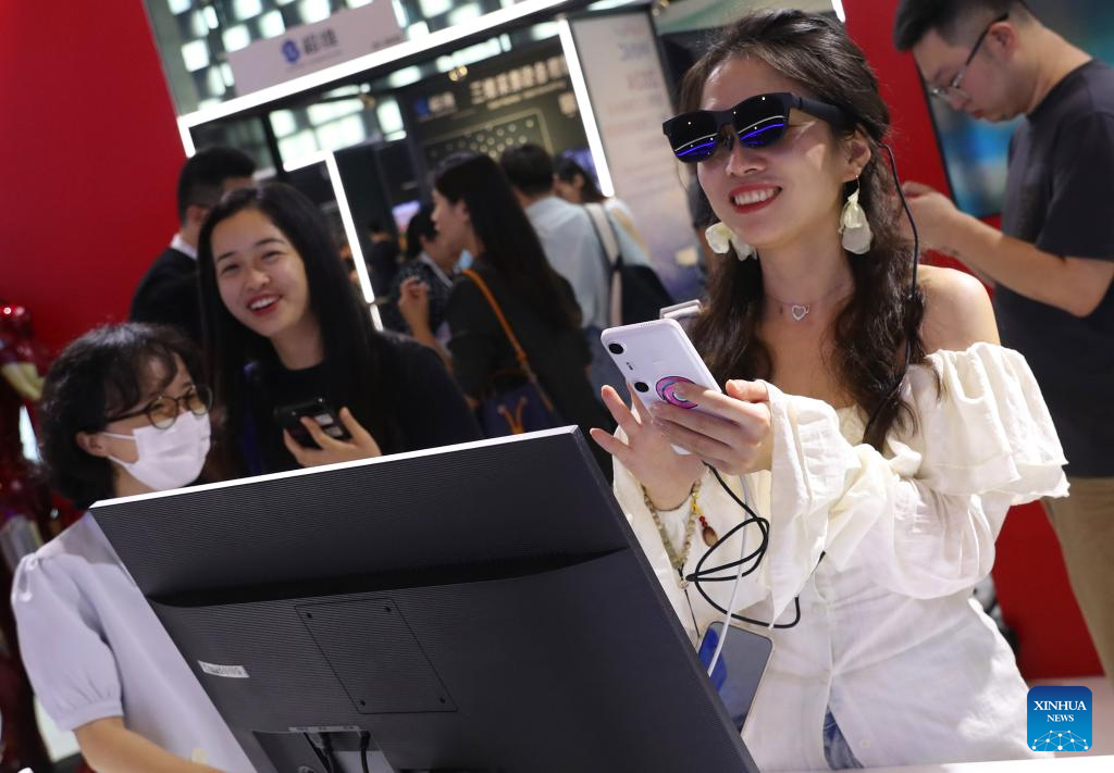 A visitor tries a pair of AR glasses on during the 2024 World AI Conference in Shanghai, east China, July 4, 2024. (Xinhua/Fang Zhe)