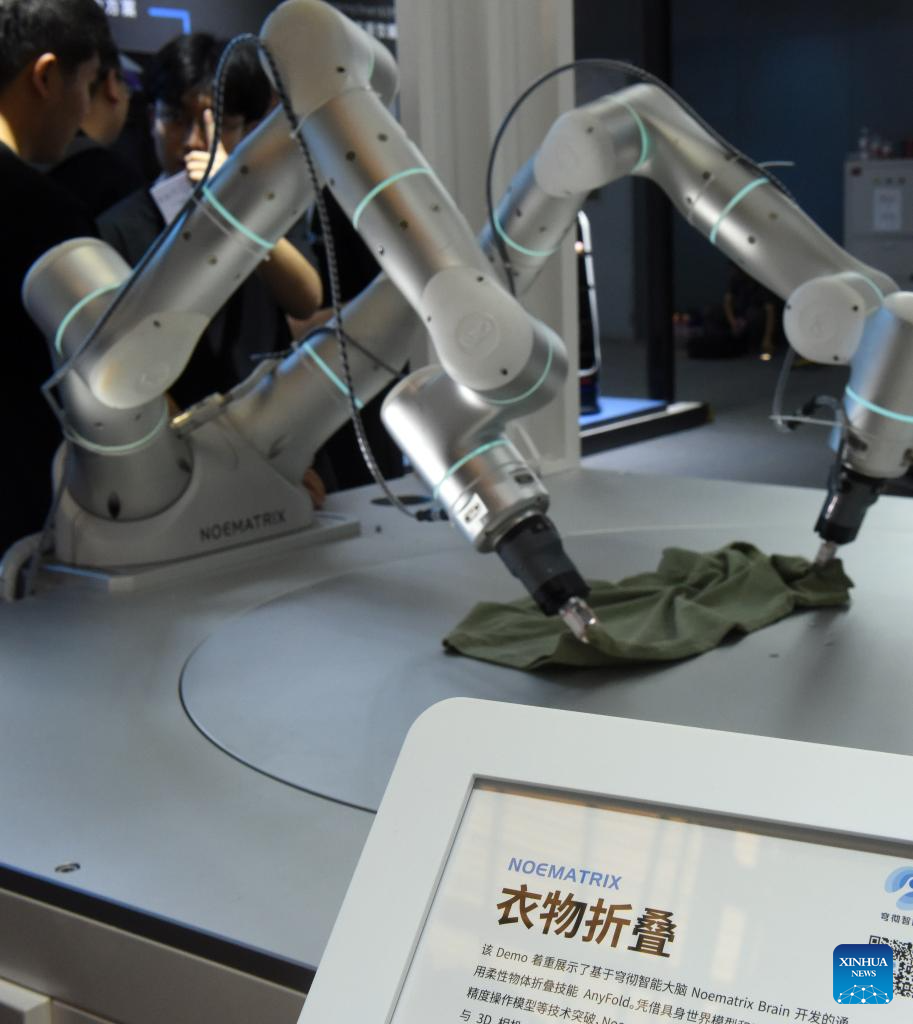 A robot folds a piece of clothing during the 2024 World AI Conference in Shanghai, east China, July 4, 2024. (Xinhua/Huang Xiaoyong)