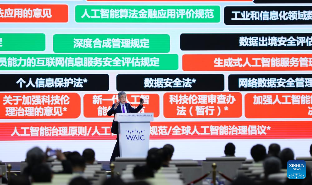 Xue Lan, dean of Schwarzman College at Tsinghua University, speaks during a plenary meeting after the opening ceremony of the 2024 World AI Conference and High-Level Meeting on Global AI Governance in Shanghai, east China, July 4, 2024. (Xinhua/Fang Zhe)