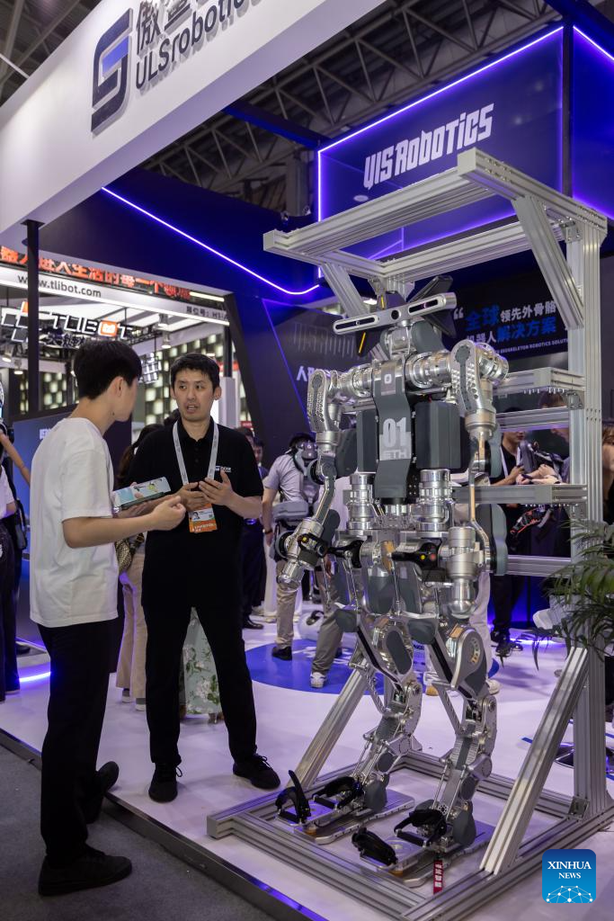 A visitor tries a set of exoskeleton gears during the 2024 World AI Conference in Shanghai, east China, July 4, 2024. (Xinhua/Fang Zhe)