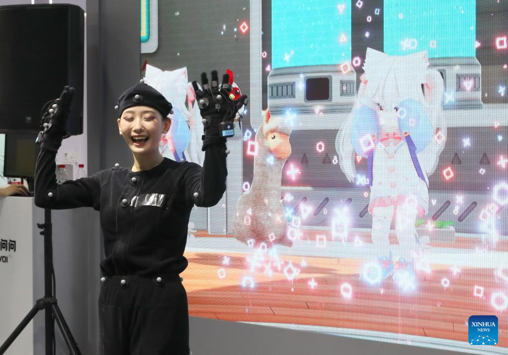 A staff member demonstrates 3D motion capture technology during the 2024 World AI Conference in Shanghai, east China, July 4, 2024. (Xinhua/Fang Zhe)