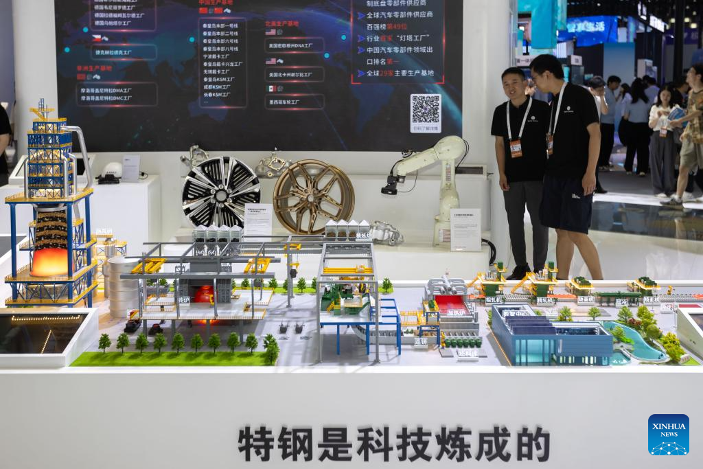 People look at a model of smart factory at the booth of CITIC Group during the 2024 World AI Conference in Shanghai, east China, July 4, 2024. (Xinhua/Wang Xiang)