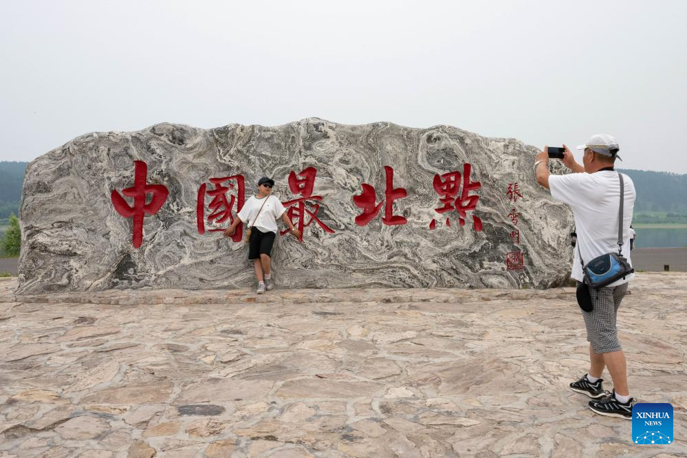 A tourist poses for a photo with the stone tablet which bears the inscription "Northernmost Point of China" in Mohe, northeast China's Heilongjiang Province, July 3, 2024. Lots of visitors travel to Mohe, China's northernmost city, in summer to enjoy some leisure time. In recent years, Mohe, focusing on its unique location, continues to improve its infrastructure and develop tourism products to attract more tourists in all seasons. (Xinhua/Xie Jianfei)