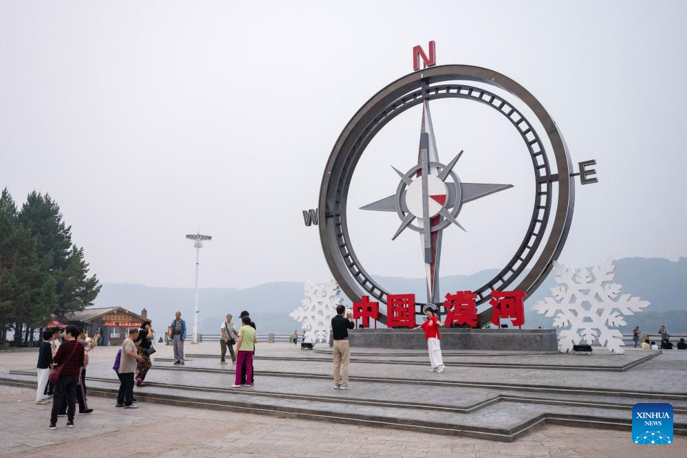 Tourists visit the polaris square in Mohe, northeast China's Heilongjiang Province, July 4, 2024. Lots of visitors travel to Mohe, China's northernmost city, in summer to enjoy some leisure time. In recent years, Mohe, focusing on its unique location, continues to improve its infrastructure and develop tourism products to attract more tourists in all seasons. (Xinhua/Xie Jianfei)