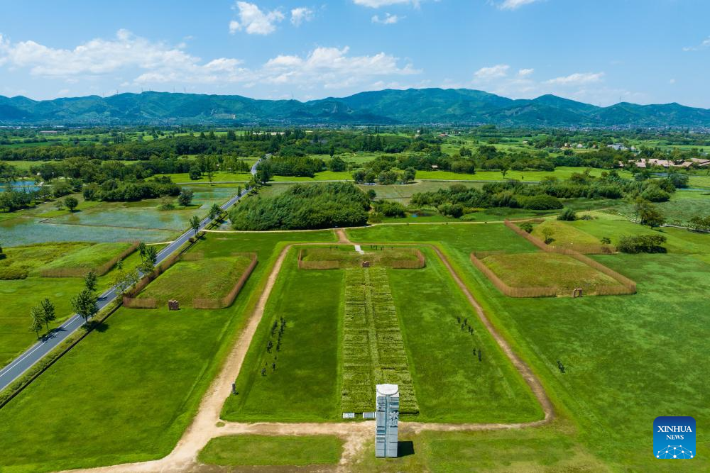 An aerial drone photo taken on July 4, 2024 shows the Archaeological Ruins of Liangzhu City park in Hangzhou, capital city of east China's Zhejiang Province. The Archaeological Ruins of Liangzhu City, located in east China's Zhejiang Province, have gained worldwide recognition as bearing testimony to the existence of at least 5,000 years of Chinese civilization. This year marks the 5th anniversary of its inscription on the World Heritage List as a cultural site. (Xinhua/Jiang Han)