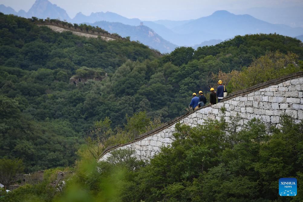 Workers walk on the Jiankou section of the Great Wall in Beijing, capital of China, July 2, 2024.