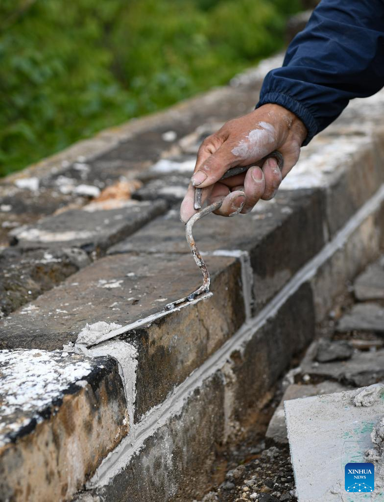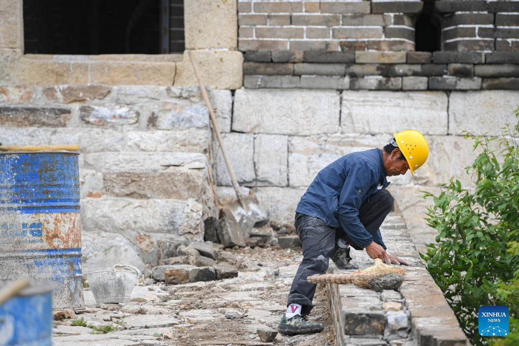 A repairer works at the Jiankou section of the Great Wall in Beijing, capital of China, July 1, 2024.