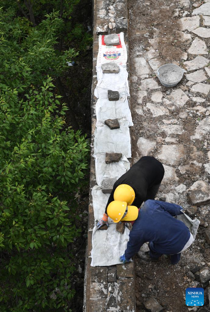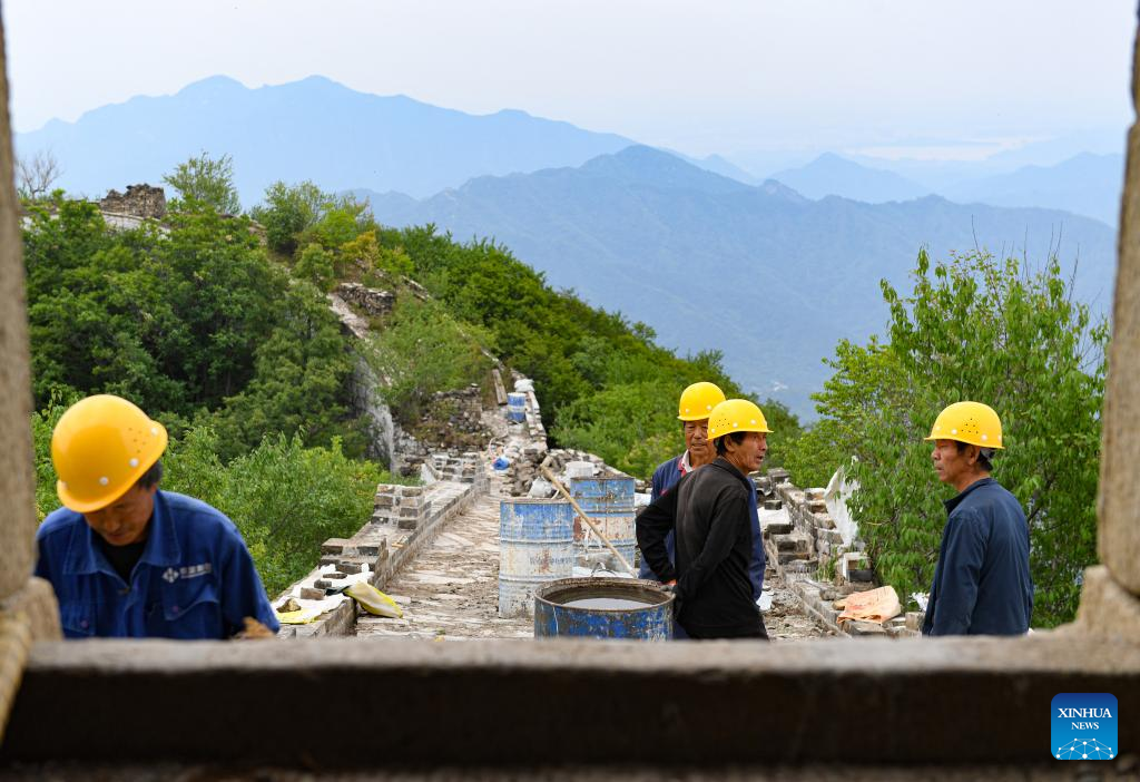 Repairers work at the Jiankou section of the Great Wall in Beijing, capital of China, July 2, 2024.