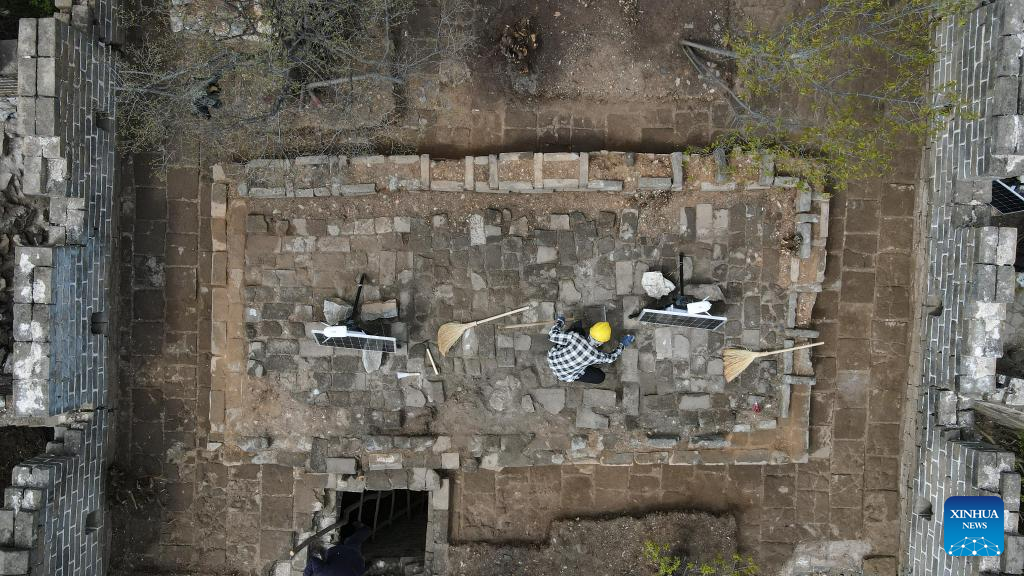 An aerial drone photo taken on April 30, 2024 shows workers working at an archaelogical site of a watch tower of the Jiankou section of the Great Wall in Beijing, capital of China.