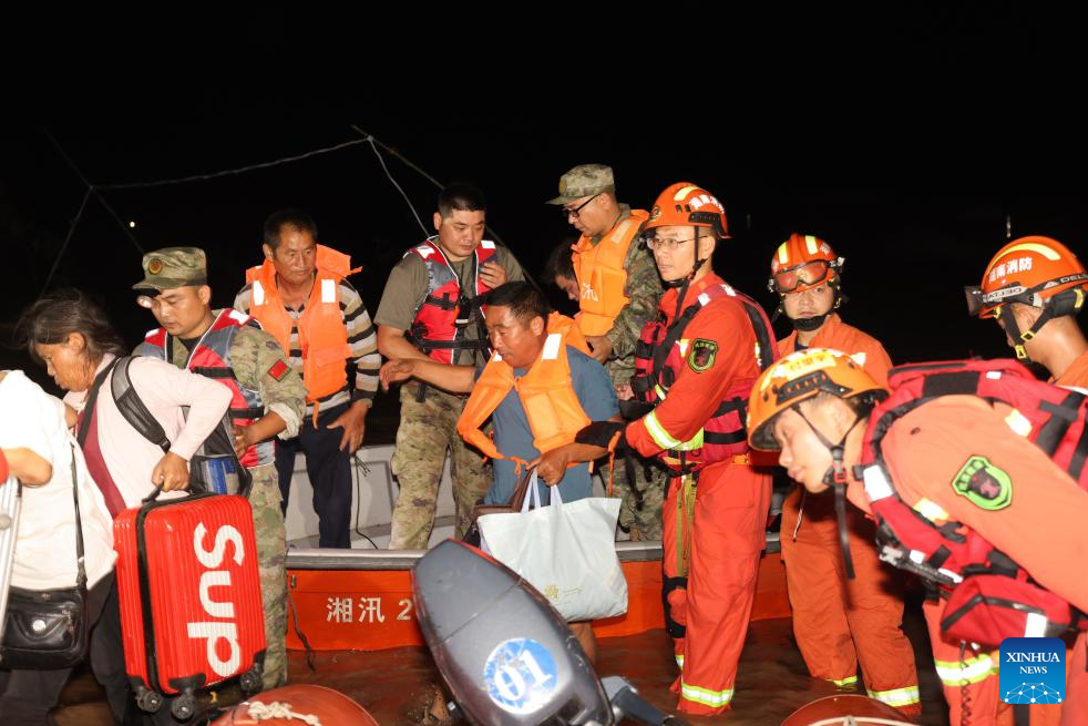 Rescuers transfer stranded residents in Tuanzhou Township, Huarong County under Yueyang City, central China's Hunan Province, July 6, 2024. (Fire and Rescue Department of Hunan/Handout via Xinhua)
