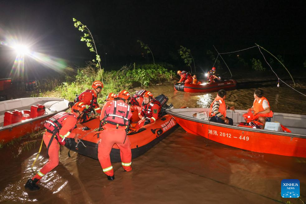 Rescuers work in Tuanzhou Township, Huarong County under Yueyang City, central China's Hunan Province, July 5, 2024. (Xinhua/Chen Sihan)