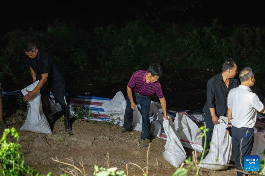 Rescuers reinforce a dike in Tuanzhou Township, Huarong County under Yueyang City, central China's Hunan Province, July 6, 2024. (Xinhua/Chen Sihan)