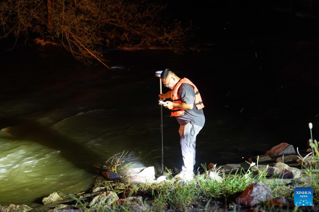 A rescuer monitors the water level in Tuanzhou Township, Huarong County under Yueyang City, central China's Hunan Province, July 6, 2024. (Xinhua/Chen Sihan)