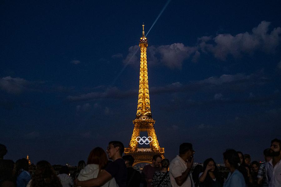 This photo taken on June 28, 2024 shows the Eiffel Tower with Olympic rings in Paris, France. (Xinhua/Sun Fei)