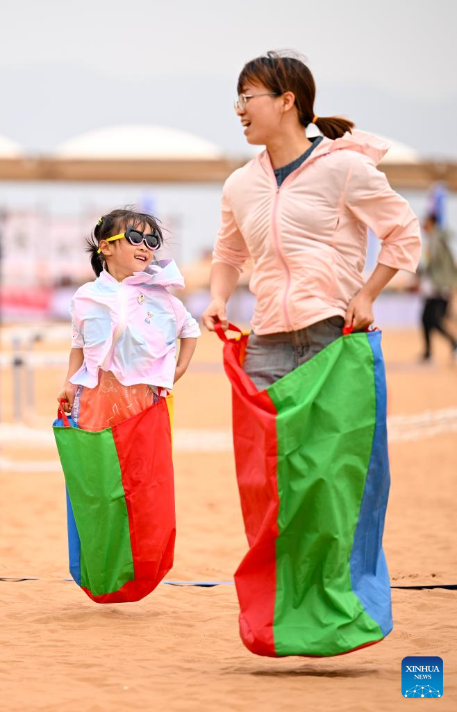 Contestants compete in a parent-child treasure hunting event during the desert fun games at Shapotou scenic spot in Zhongwei, northwest China's Ningxia Hui Autonomous Region, July 7, 2024. The desert fun games is being held here from July 6 to 8, expected to attract more than 1,000 contestants. (Xinhua/Feng Kaihua)