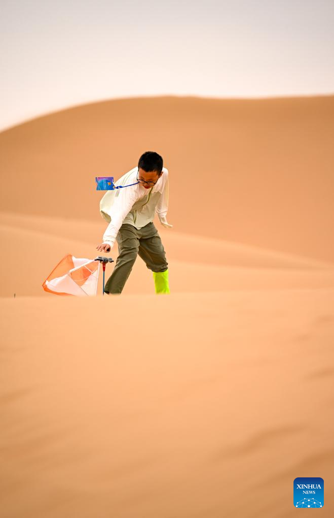 A contestant competes in a parent-child treasure hunting event during the desert fun games at Shapotou scenic spot in Zhongwei, northwest China's Ningxia Hui Autonomous Region, July 7, 2024. The desert fun games is being held here from July 6 to 8, expected to attract more than 1,000 contestants. (Xinhua/Feng Kaihua)