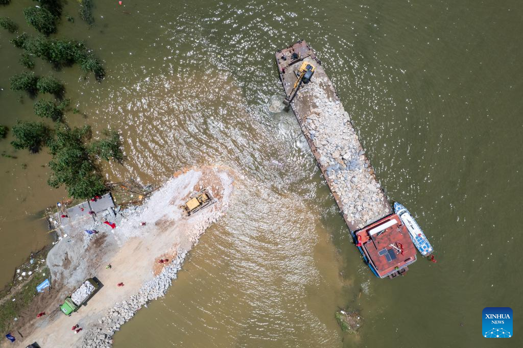 An aerial drone photo shows rescuers working to block the dike breach in the Dongting Lake in Huarong County, central China's Hunan Province, July 7, 2024. (Xinhua/Chen Sihan)