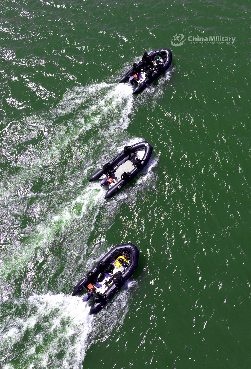 Anti-mine frogmen assigned to a group under the PLA Navy take combat rubber raiding crafts (CRRC) to the designated waters during a mine-hunting diving training exercise in mid-June, 2024. (eng.chinamil.com.cn/Photo by Wang Hu)