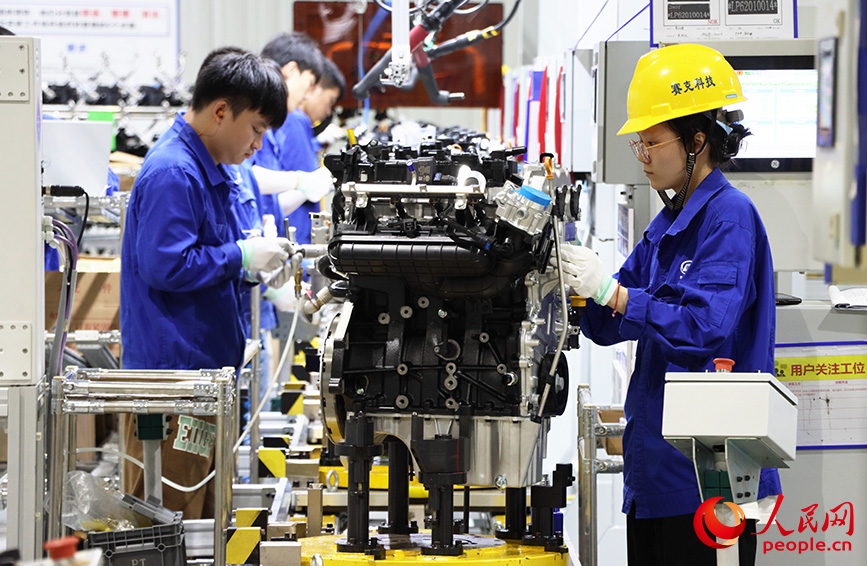 Workers check engines before they roll off the production line in the smart factory of Liuzhou Saike Technology Development Co., Ltd. in Liuzhou, south China's Guangxi Zhuang Autonomous Region. (People's Daily Online/Fu Huazhou)