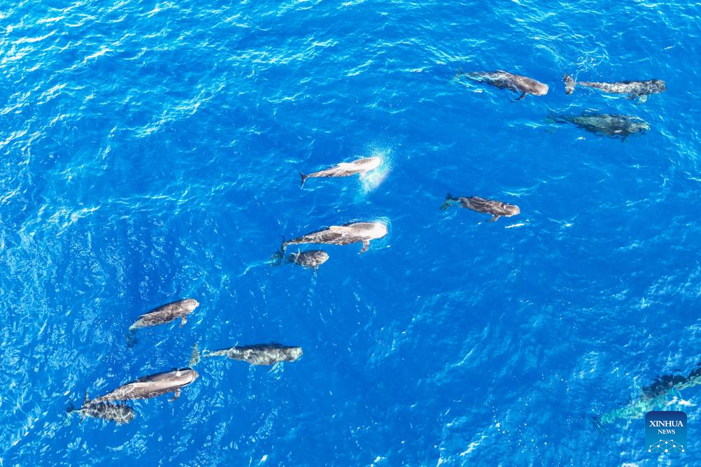 An aerial drone photo shows short-finned pilot whales swimming in the waters east of Hainan Island, south China, July 5, 2024. A marine biodiversity expedition team has recently witnessed a large number of cetaceans in the waters east of Hainan Island, including short-finned pilot whales, Fraser's dolphins and rough-toothed dolphins. Among the cetacean species, many mother-child pairs have been spotted. (Xinhua/Zhang Liyun)