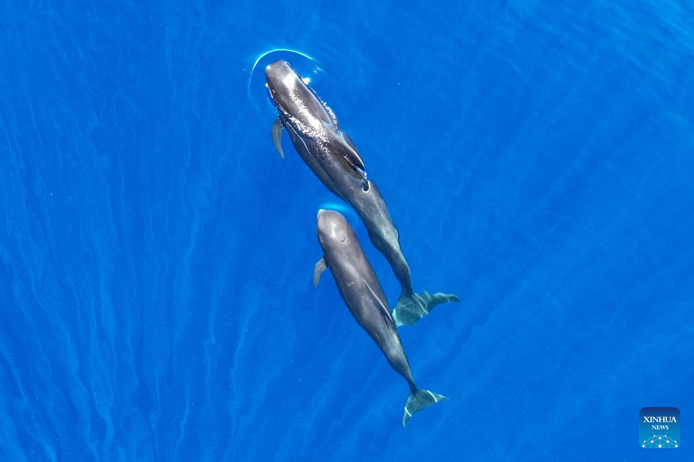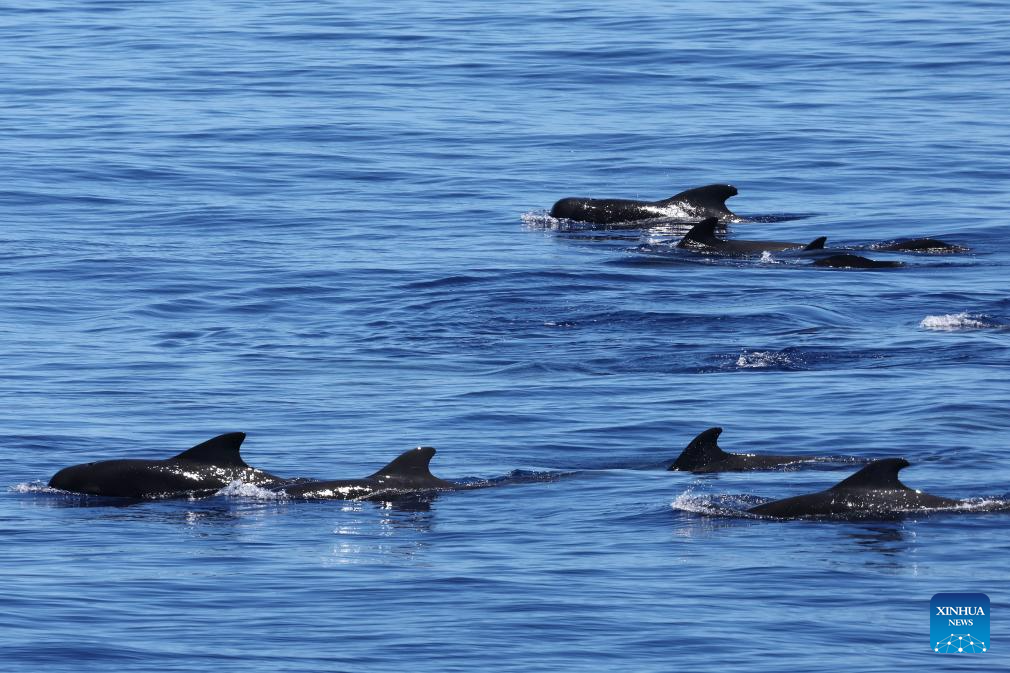 Short-finned pilot whales swim in the waters east of Hainan Island, south China, July 6, 2024. A marine biodiversity expedition team has recently witnessed a large number of cetaceans in the waters east of Hainan Island, including short-finned pilot whales, Fraser's dolphins and rough-toothed dolphins. Among the cetacean species, many mother-child pairs have been spotted. (Xinhua/Zhang Liyun)
