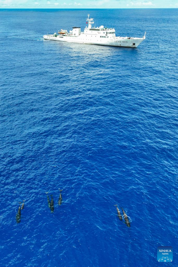 Members of a marine biodiversity expedition team observe on deck in the waters east of Hainan Island, south China, July 5, 2024. A marine biodiversity expedition team has recently witnessed a large number of cetaceans in the waters east of Hainan Island, including short-finned pilot whales, and rough-toothed dolphins. Among the cetacean species, many mother-child pairs have been spotted. (Xinhua/Zhang Liyun)