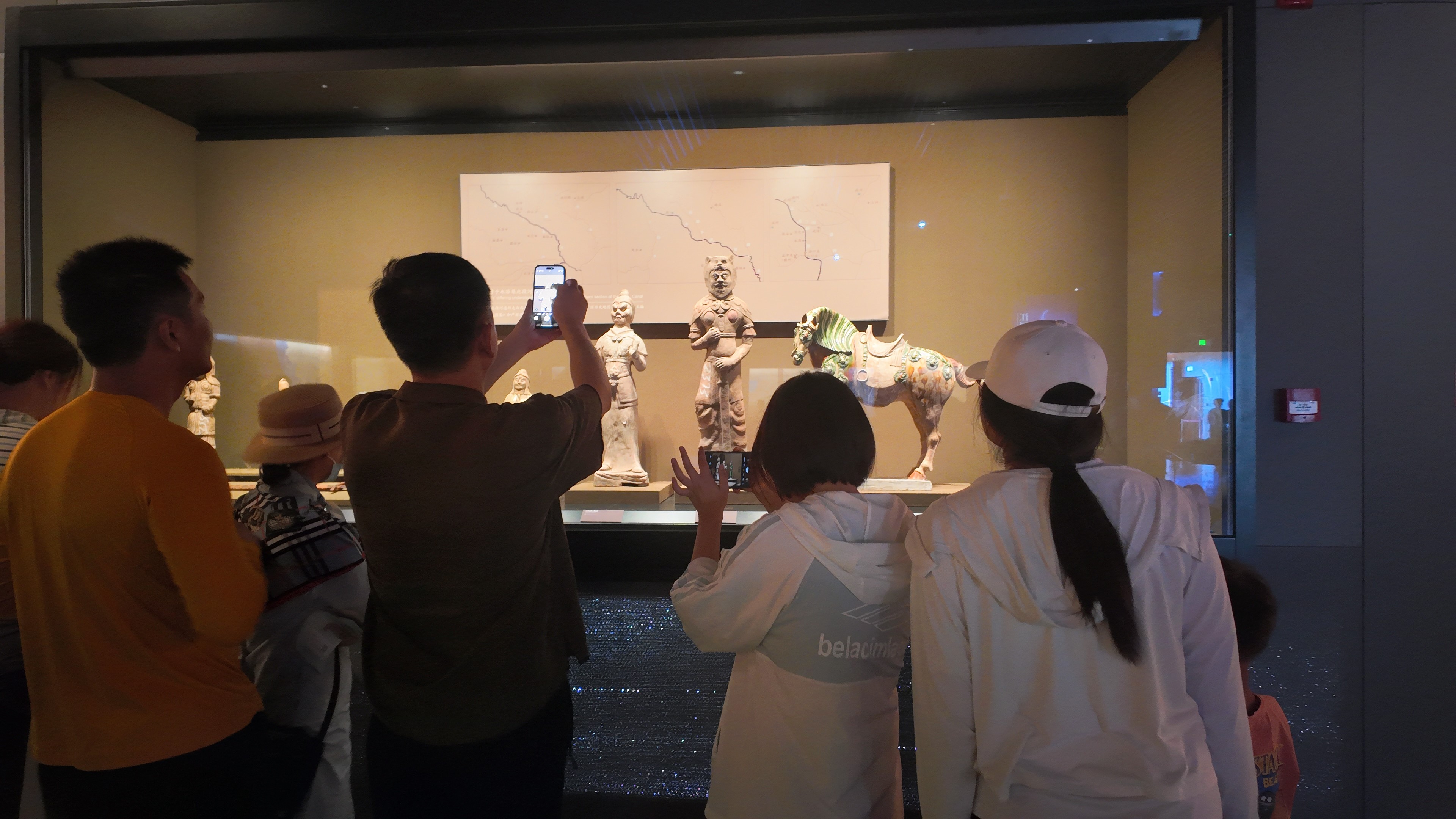 Visitors view tea sets from the Tang Dynasty in the "Prosperity and Sustainability: Exhibition of the History and Culture of Beijing and the Grand Canal" at the Grand Canal Museum of Beijing on July 4, 2024. (People’s Daily Online/Xue Yanyan)