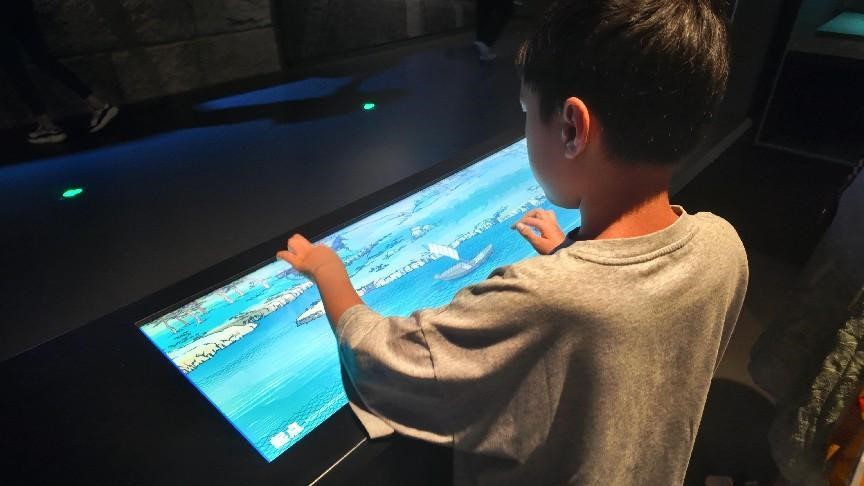 Photo taken on July 4, 2024, shows a boy playing a simulated game to calculate the capacity and rate of the Grand Canal at the Grand Canal Museum of Beijing. (People’s Daily Online/Xue Yanyan)