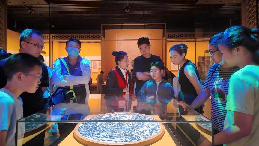 Visitors observe a circular porcelain plaque with a blue-and-white pattern from the Qing Dynasty at the Grand Canal Museum of Beijing on July 4, 2024. (People’s Daily Online/Xue Yanyan)