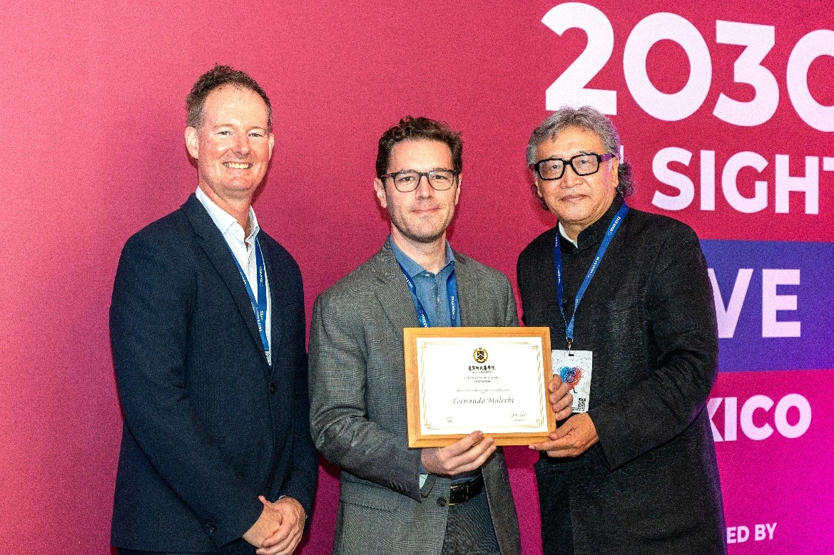 Mr. Drew Keys, the President of IAPB West Pacific and Latin America, and Professor He Wei present the appointment letter to Professor Jorge Foster from the University of Buenos Aires, Argentina. (Photo provided to People’s Daily Online)