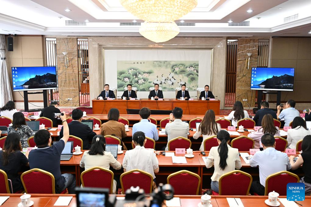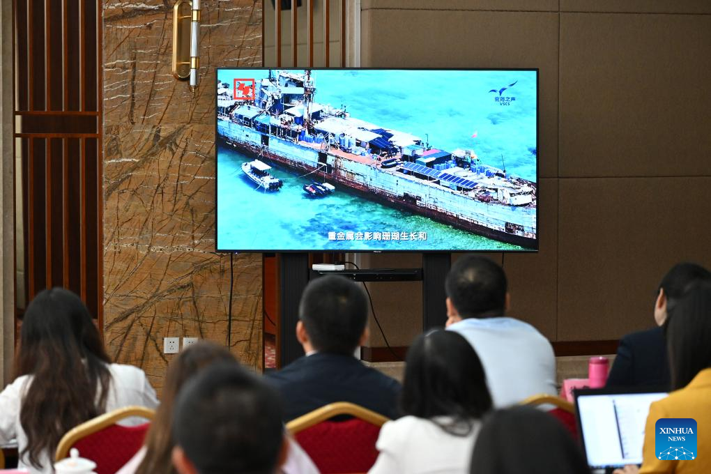 This photo taken on July 8, 2024 shows the releasing ceremony of A Survey Report on the Damage to Coral Reef Ecosystem by Illegally Grounded Military Vessel at Ren'ai Jiao in Beijing, capital of China. (Xinhua/Li Xin)
