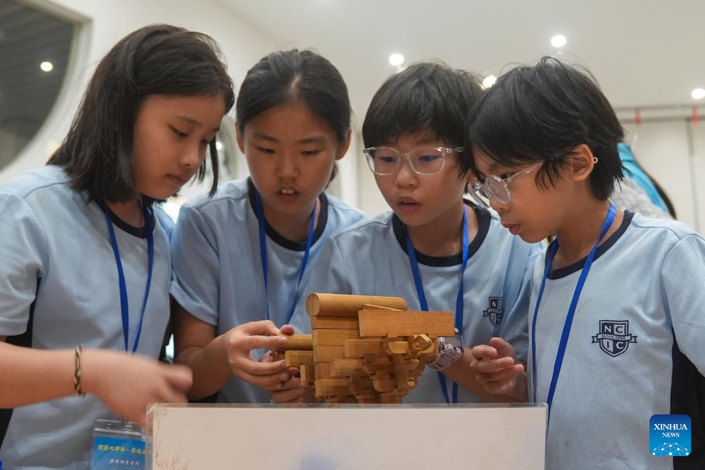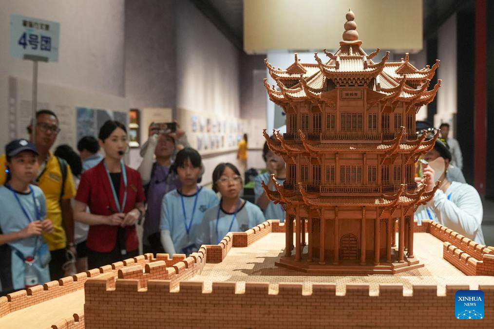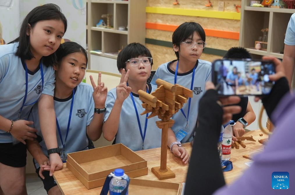 Youngsters try to assemble architecture model blocks at the China Architecture Science and Technology Museum in Wuhan, central China's Hubei Province, July 8, 2024. A group of youngsters from Hong Kong and Macao and guests participated in a study tour in Wuhan, jointly hosted by the Hubei Provincial Department of Culture and Tourism and China Construction Third Engineering Bureau Group Co., LTD. (Xinhua/Du Zixuan)
