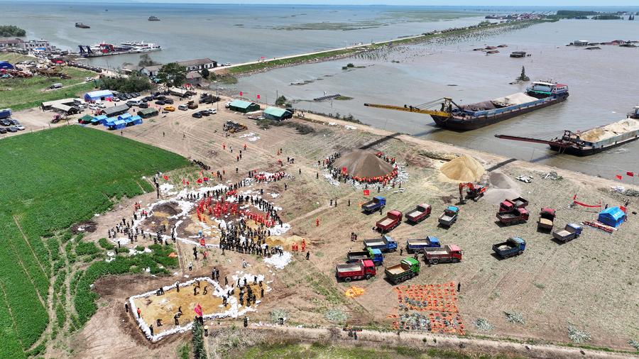 In this aerial drone photo, rescuers work on an embankment to stem the piping effect in Huarong County, central China's Hunan Province, July 8, 2024. (Xinhua/Chen Zhenhai)