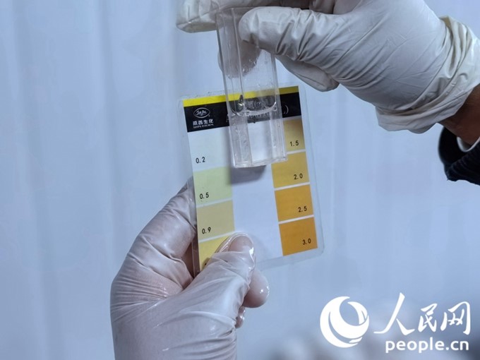 A staff member tests the water quality of a recirculating aquaculture system at a land-based seafood cultivation facility in Zhangye city, northwest China's Gansu Province. (People's Daily Online/Huang Jinxiaohu)