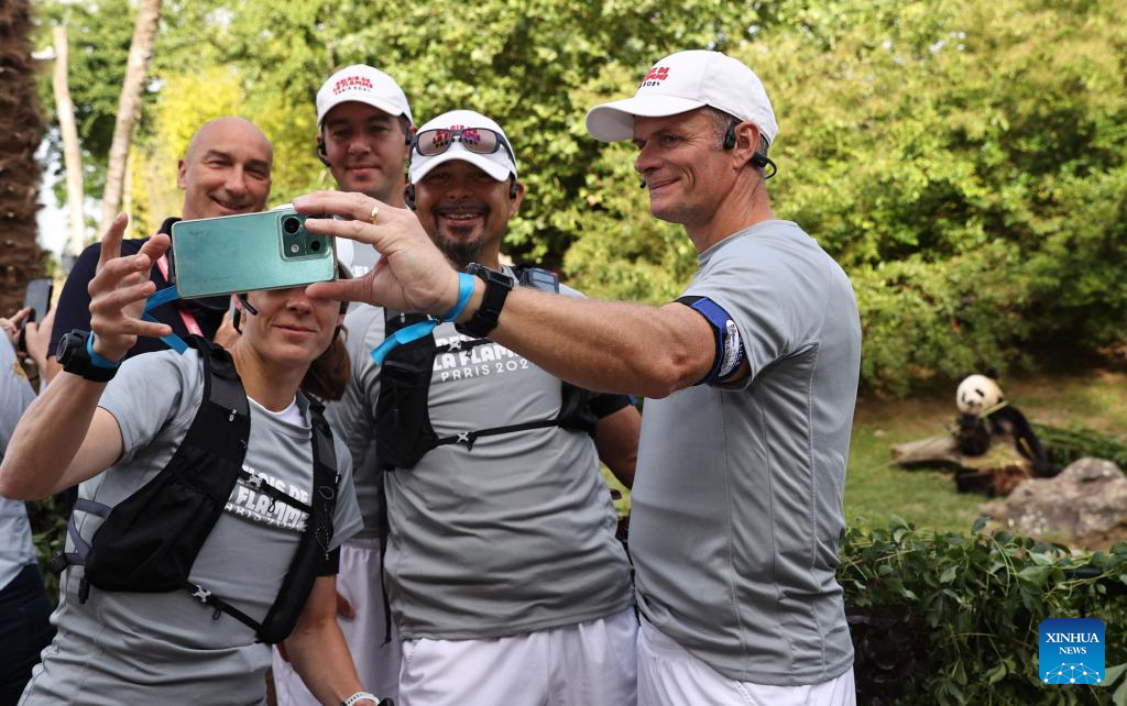 People pose for photos with giant panda Yuan Zai before the relay of the Olympic flame of Paris 2024 at Beauval Zoo in Saint-Aignan, central France, July 8, 2024. (Xinhua/Gao Jing)