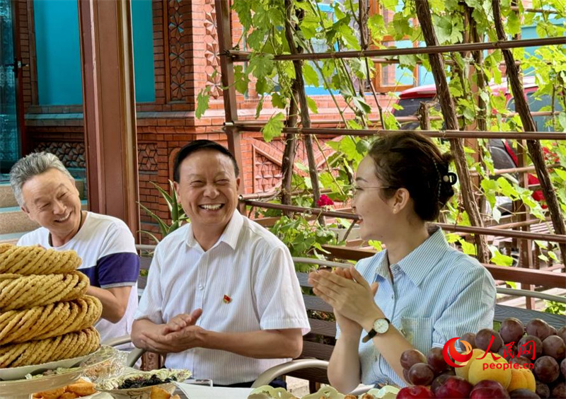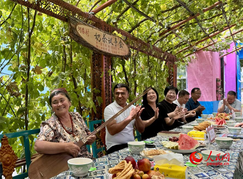 On June 23, political advisors, community officials, and residents gathered under grape trellises in the courtyard of a house located on Liuxing street, a historical block in Yining city, Ili Kazak Autonomous Prefecture, northwest China's Xinjiang Uygur Autonomous Region, where they enjoyed cups of milk tea while engaging in relaxed conversations.