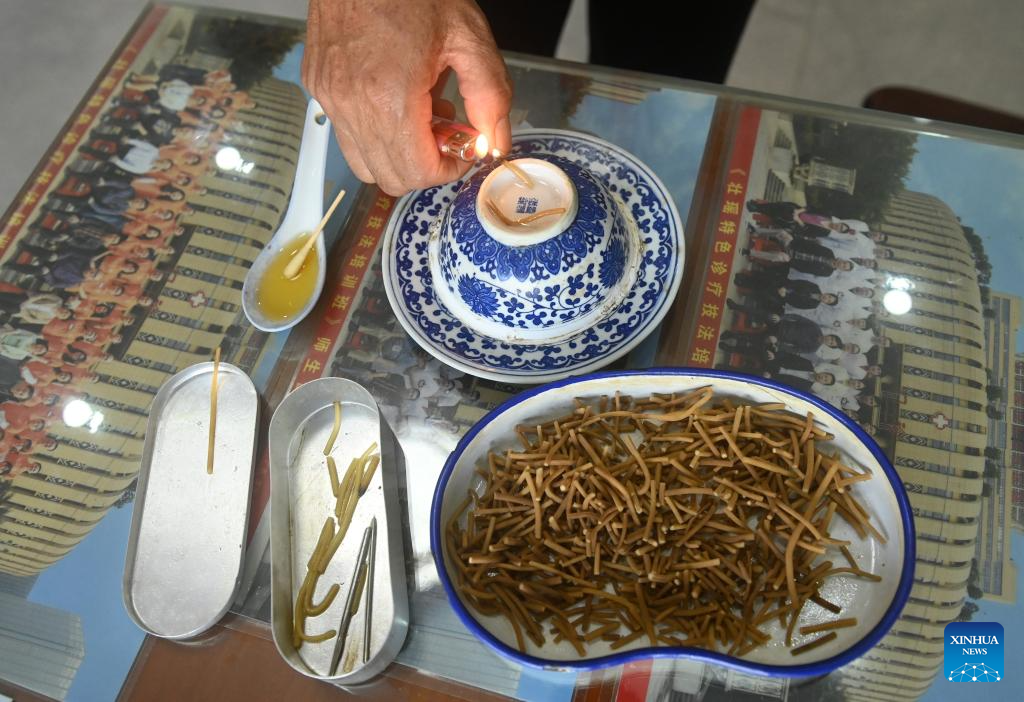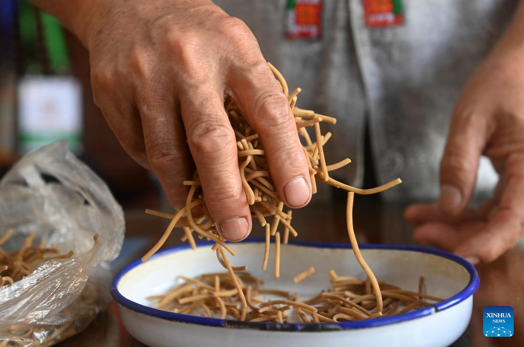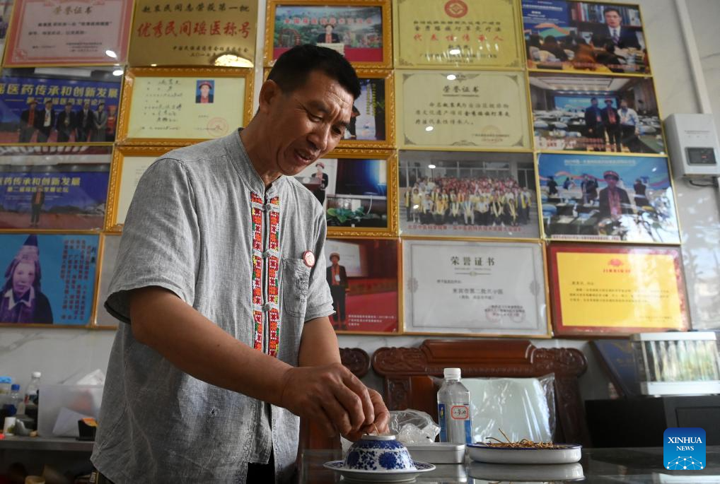 Zhao Zhongmin processes a preparation for a patient in Tongmu Township of Jinxiu Yao Autonomous County, south China's Guangxi Zhuang Autonomous Region, July 9, 2024. (Xinhua/Lu Boan)
