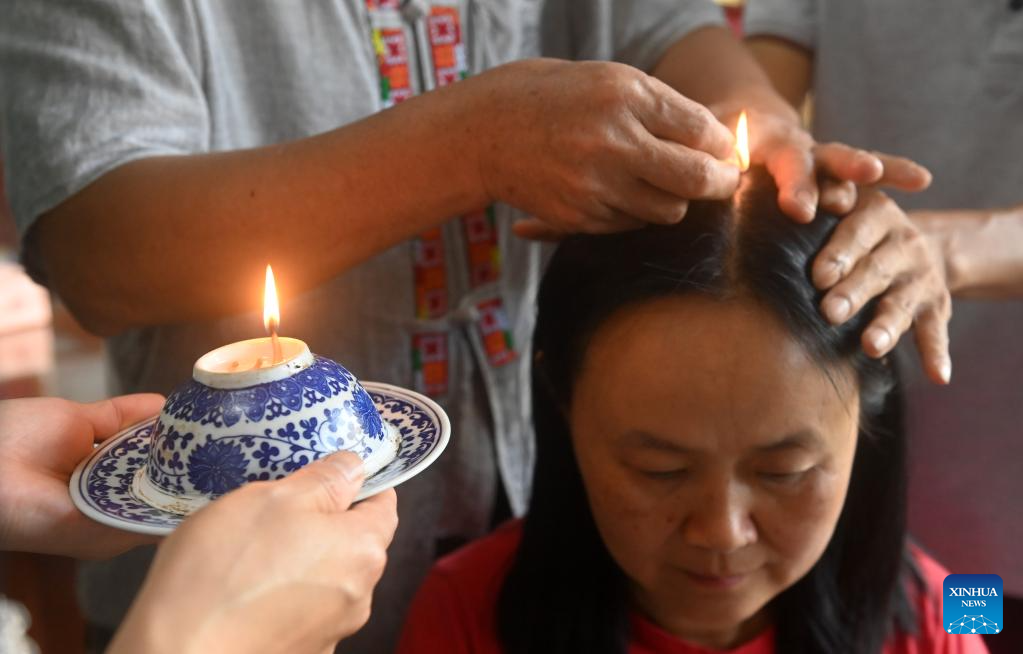 Zhao Zhongmin is an inheritor of Jinxiu Yao ethnic herb moxibustion therapy, a regional intangible cultural heritage of Guangxi that helps a recipient enhance body functions by burning herbal preparations at or above acupuncture points on the skin.