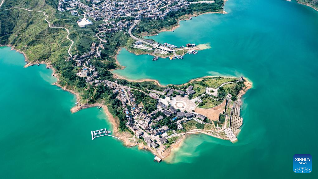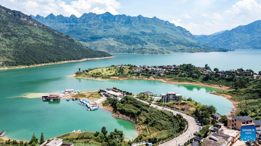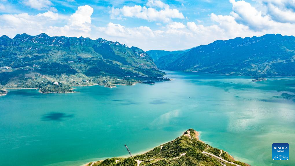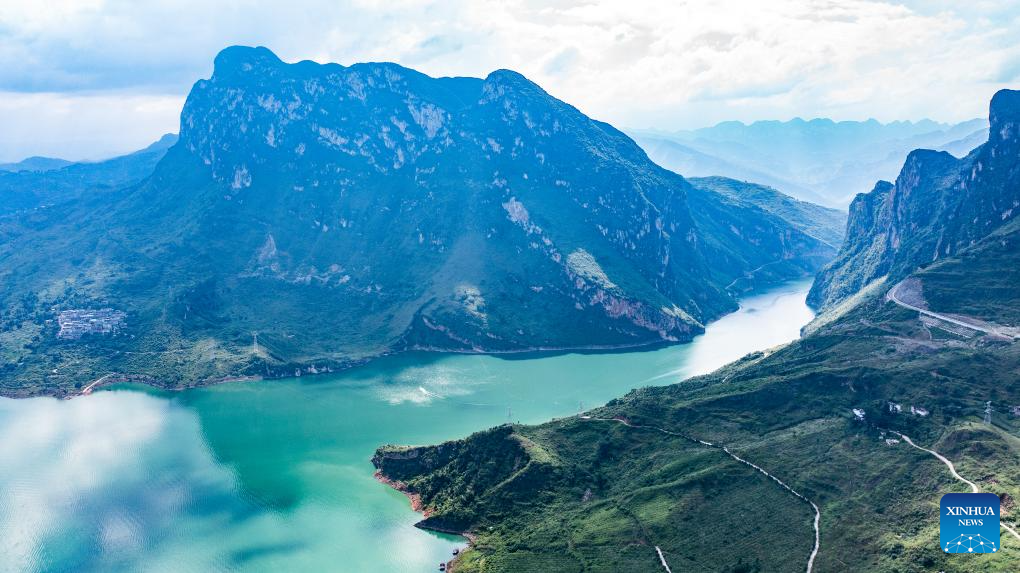 This aerial drone photo taken on July 10, 2024 shows a view of the Zangke river scenic area in Liupanshui, southwest China's Guizhou Province. (Xinhua/Tao Liang)
