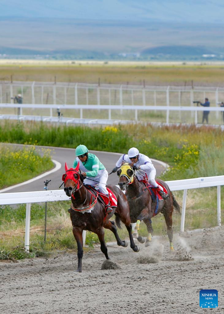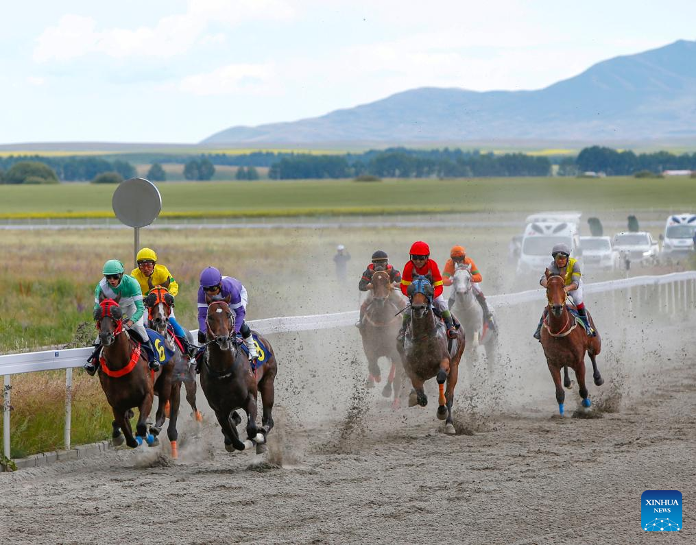 Jockeys compete during the 1,000m match of the equestrian events at the 12th National Traditional Games of Ethnic Minorities of China in Zhaosu, northwest China's Xinjiang Uygur Autonomous Region, July 10, 2024. (Xinhua/Chen Shuo)