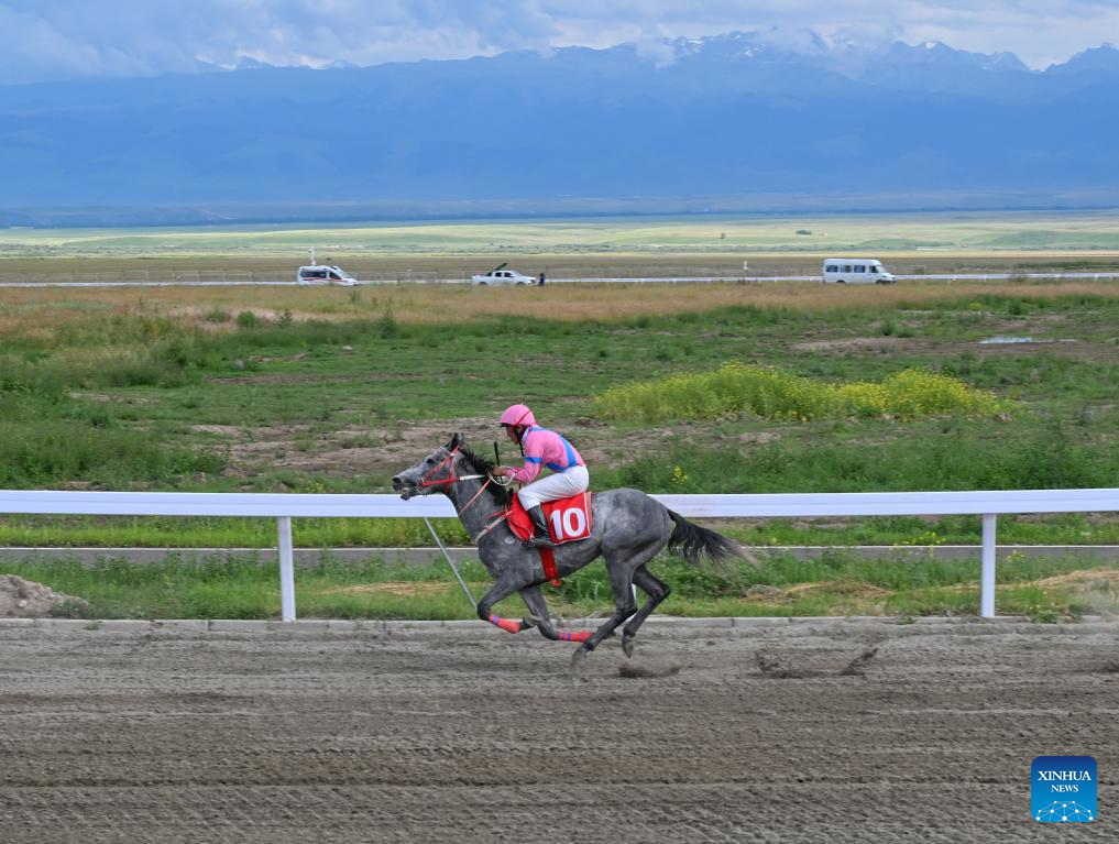 A jockey competes during the 1,000m match of the equestrian events at the 12th National Traditional Games of Ethnic Minorities of China in Zhaosu, northwest China's Xinjiang Uygur Autonomous Region, July 10, 2024. (Xinhua/Chen Shuo)