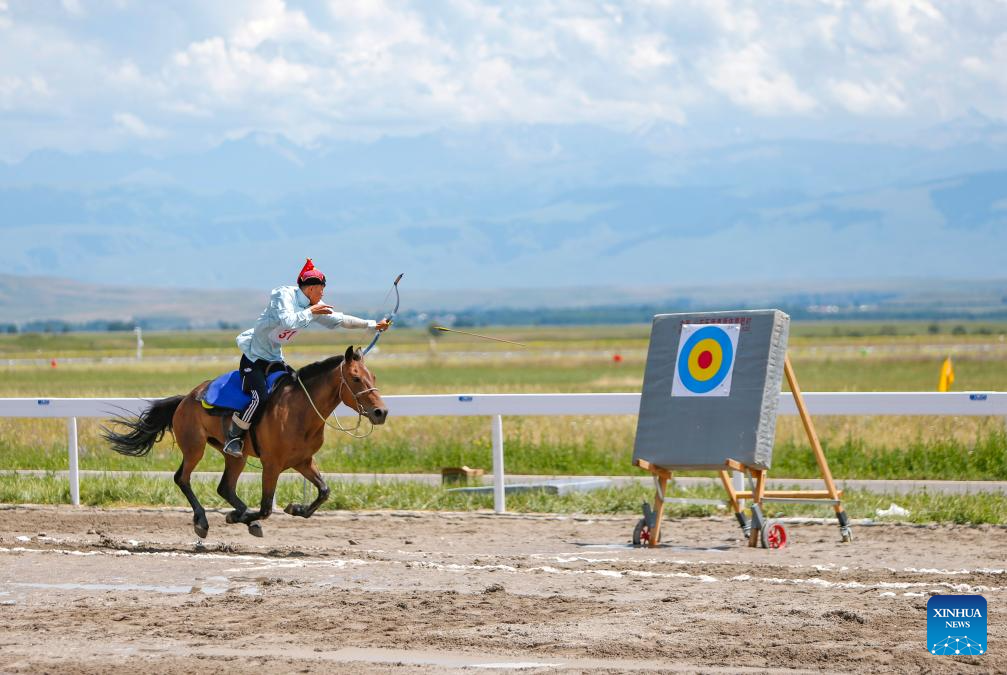 An athlete competes during the riding and archery match of the equestrian events at the 12th National Traditional Games of Ethnic Minorities of China in Zhaosu, northwest China's Xinjiang Uygur Autonomous Region, July 10, 2024. (Xinhua/Chen Shuo)