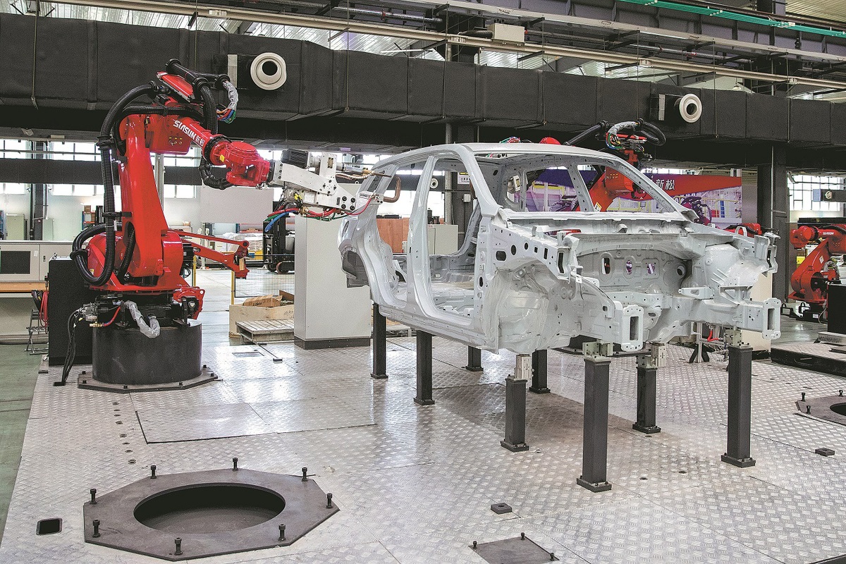 Robots manufacture a passenger vehicle at a factory of Siasun Robot and Automation Co in Shenyang, Liaoning province, last month. (LI XULUN/XINHUA)