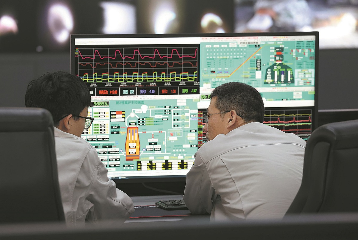 Staff members have a discussion at the Ansteel Group's Ironmaking Central Control Center in Anshan on June 15. (ZHU XINGXIN/CHINA DAILY)