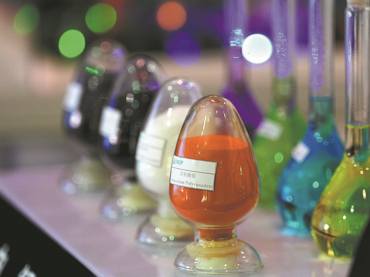 Chemicals used to produce high-tech batteries to more effectively store renewable energy are displayed at Dalian Rongke Power Co. in Dalian, Liaoning. (ZHANG LEI/XINHUA)
