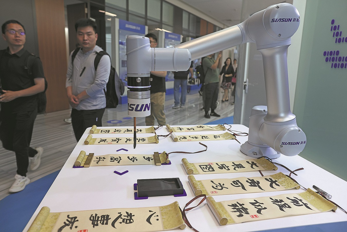 Visitors watch a robot writing Chinese calligraphy at Siasun's base in Shenyang. (ZHU XINGXIN/CHINA DAILY)